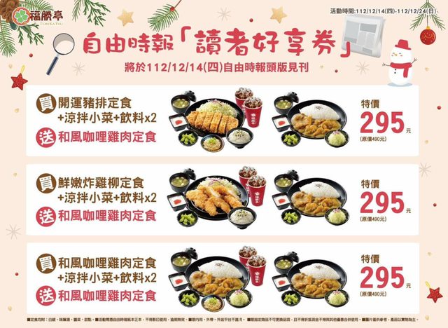 2023最後一個月大家好嗎? 小編最喜歡的月份就是12月了~ 因為除了會有聖誕節滿滿的幸福感 還會有許多好消息~ 嗯?問我有什麼好消息? 這不就來了嗎 購買今日的自由時報即可獲得 福勝亭「買套餐送主餐」的優惠喔 簡直是超級划算! 兌換日期:112/12/14-112/12/24 有買到報紙的粉絲們 記得在12/24日前兌換呦 -- ※ 發信站: 批踢踢實業坊(www.ptt-site.org.tw), 來自: 101.137.245.40 (臺灣) ※ 文章網址: https://www.ptt-site.org.tw/Lifeismoney/M.1702531623.A.2E4