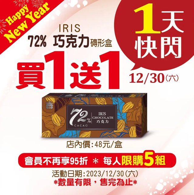 活動日期:2023/12/30(六) 活動優惠: IRIS 72% 巧克力磚形盒買一送一 https://i.imgur.com/27kIvDK.jpg
