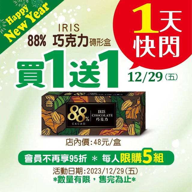 活動日期:2023/12/29(五) 活動優惠:IRIS 88% 巧克力磚形盒買一送一 https://i.imgur.com/OCKbZhT.jpg
