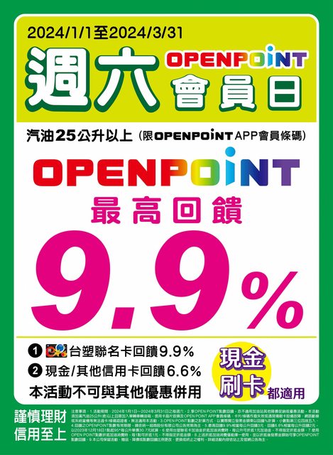 (1)以台塑聯名卡支付加油消費,按當筆加油發票金額OPEN POINT點數回饋9.9%。