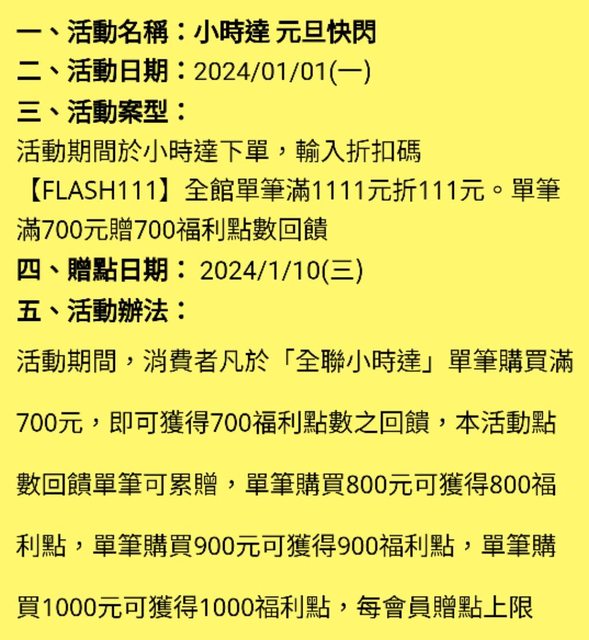 只有今天,滿1111現折111,另有滿700送70點活動。滿700送點上限為1000點。 -- ※ 發信站: 批踢踢實業坊(www.ptt-site.org.tw), 來自: 220.132.181.237 (臺灣) ※ 文章網址: https://www.ptt-site.org.tw/Lifeismoney/M.1704076140.A.7F7