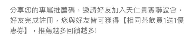 Q借問ㄍ問題: 天仁茗茶買一送一券用不到 可以去哪裡分享?怕觸犯版規! 提醒:新版規好像可以放推薦碼! https://i.imgur.com/aeCehyC.jpg