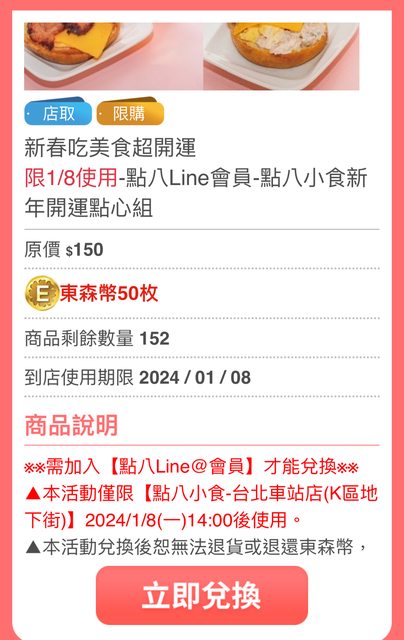 地點:台北車站K區地下街(東森廣場) 只能內用 限下午兩點以後兌換 時間:1/8,1/9,1/10 三天可以選擇 https://i.imgur.com/M2YHy7Q.jpg