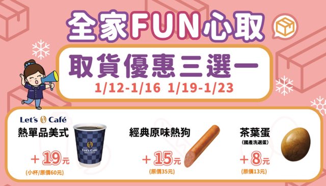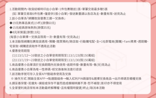 取貨優惠券三選一 熱單品美式小杯19元、經典原味熱狗15元、茶葉蛋8元 活動時間是我看完活動辦法覺得比較需要注意 有兩段,都是星期五到星期二,各限量150萬組 1/12-1/16(兌換期限到1/23) 1/19-1/23(兌換期限到1/30) -- ※ 發信站: 批踢踢實業坊(www.ptt-site.org.tw), 來自: 110.28.64.59 (臺灣) ※ 文章網址: https://www.ptt-site.org.tw/Lifeismoney/M.1704778678.A.A61