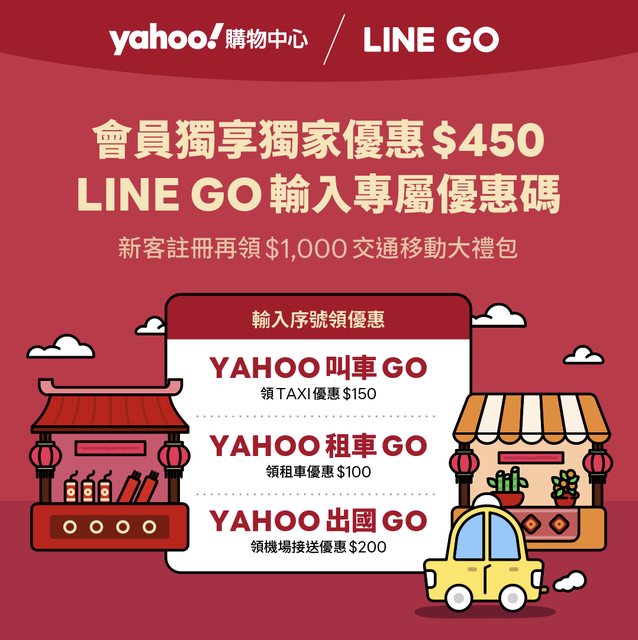 ▌活動期間:2024 年 1 月 8 日 10:00 至 2024 年 2 月 14 日 24:00 ▌活動內容:Yahoo 購物中心|LINE GO歲末年終年貨大街,會員獨享叫車、租車及機場接送三大限量好禮,輸碼最高拿 $450乘車優惠! ▌活動注意事項: Yahoo 購物中心年貨大街|乘車優惠,於LINE GO官方帳號輸入專屬優惠碼「YAHOO叫車GO」,馬上領 $15 x 10 張,共 $150 TAXI 乘車優惠,數量10,000 組,領完為止。自2024 年 1 月 8 日起至 2024 年 2 月 14 日止領取,限領取後 14 天內、綁定線上支付使用。 Yahoo 購物中心年貨大街|租車優惠,於LINE GO官方帳號輸入專屬優惠碼「YAHOO租車GO」,馬上領 $50 x 2 張,共 $100 租車優惠,數量10,000 組,領完為止。自2024 年 1 月 8 日起至 2024 年 2 月 14 日止領取,限領取後 30 天內、綁定線上支付使用。 Yahoo 購物中心年貨大街|桃機即時接機優惠,於LINE GO官方帳號輸入專屬優惠碼「YAHOO出國GO」,馬上領 $100 x 2 張,共 $200 機場接送優惠,數量10,000 組,領完為止。自2024 年 1 月 8 日起至 2024 年 2 月 14 日止領取,限領取後 30 天內、綁定線上支付使用,限桃園機場即時接機使用。 ----- Sent from JPTT on my iPhone -- ※ 發信站: 批踢踢實業坊(www.ptt-site.org.tw), 來自: 61.221.208.99 (臺灣) ※ 文章網址: https://www.ptt-site.org.tw/Lifeismoney/M.1704870506.A.697