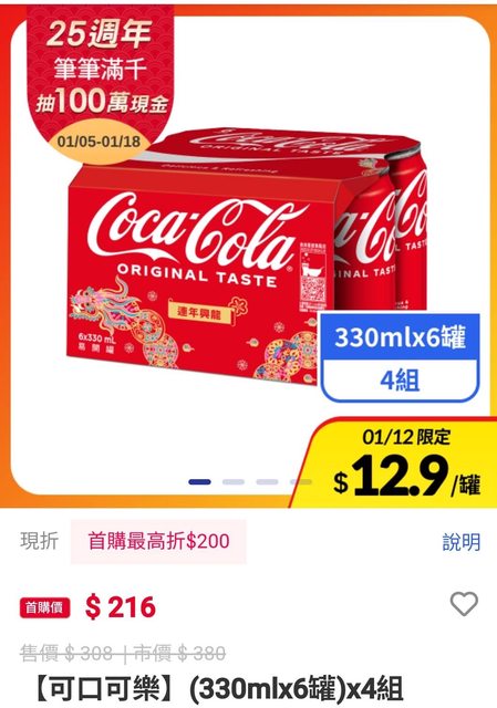 發現隔日達首購優惠有變,單件打7折,最高折200 可樂雪碧 有糖無糖今天都有特價,點進去看一樣首購一箱是216 https://reurl.cc/or0Qgq https://i.imgur.com/JmRRwjp.jpg