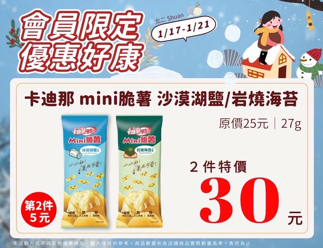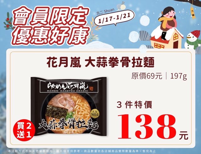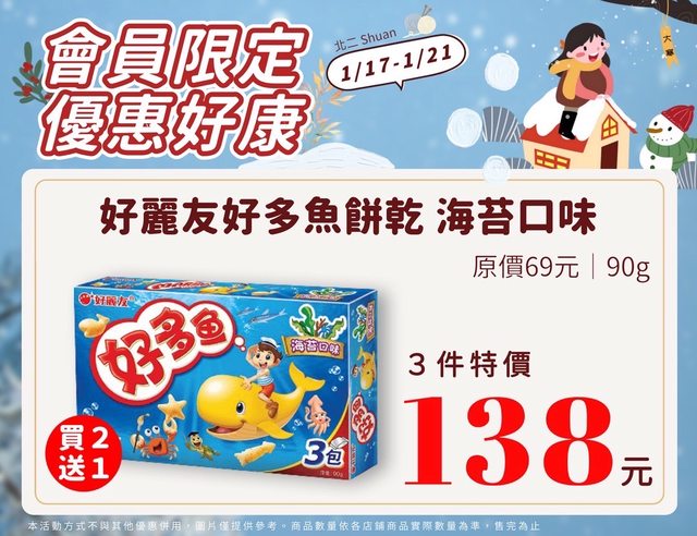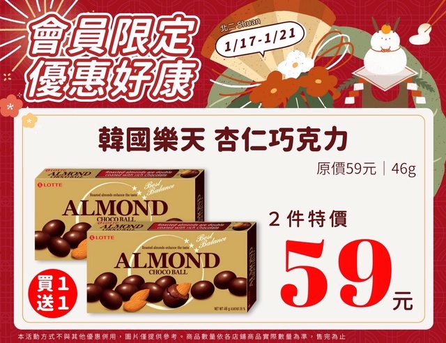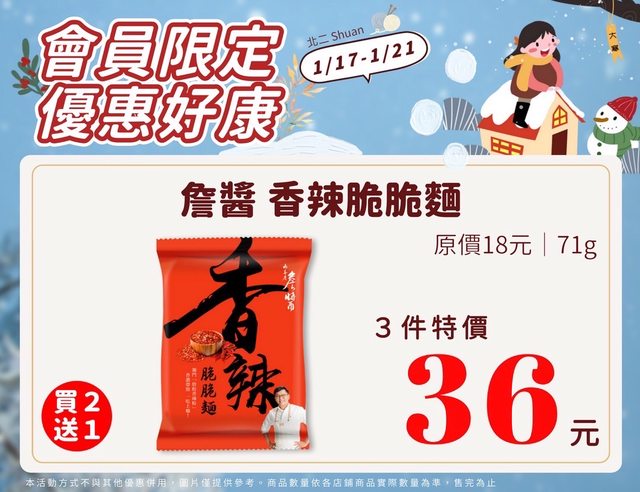 【活動名稱】:會員限時優惠 【便利商店/廠商名稱】:全家 【活動時間】:2024/01/17~2024/01/21 【活動內容】: https://i.imgur.com/p26SQK1.jpg