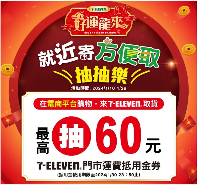 7-ELEVEN全電商平台包裹安心取件抽抽樂抽購物金 1.ꀠ自2024/1/10起至2024/1/29 23:59止,全電商平台包裹安心取件抽抽樂,取每筆包裹 限抽1次,單筆交易,最高上限獲得5張COUPON,限量150萬份送完為止。ꀊ 2.ꀠ獎項:1元購物金、8元購物金、60元購物金及門市優惠商品任2件5折條碼(中杯可口 可樂思樂冰、大熱厚乳拿鐵及大熱精品美式)共3項獎項隨機抽中。 3.ꀠ取一件抽一次可得POS Coupon( i禮贈條碼)兌換購物金或折價券,買家未取退回賣家 的包裹無法參加抽抽樂。 4.ꀠ序號兌換至2024/1/30 23:59止ꀠꀠꀠꀠꀠꂠ 5.ꀠ活動期間屆至或序號送完,活動即終止序號或優惠券限用乙次且恕不找零;經使用無 法退款;逾期即作廢,損壞、遺失不予補發。ꀠꀠꀠꀠꀠꂠ 6.ꀠ取件完成後無法取消取件ꀠꀠꀠꀠꀠꂠ 7.ꀠ每筆交易最多提供5組序號(結帳單據印出兌換小白單或報會員取件則會存入會員OPEN POINT APP裡票券內-兌換券內) 8.ꀠ序號不得複製/折換現金/出售/轉讓。ꀠꀠꂠ 9.ꀠ統一超商保有隨時修正、暫停、終止本活動之權利 10. 1元、8元、60元購物金抵用券條碼請直接拿至櫃台結帳折抵;門市優惠任2件5折條碼 ,中杯可口可樂思樂冰、大熱厚乳拿鐵及大熱精品美式任選2杯,再刷優惠條碼即可折抵 。 -- ※ 發信站: 批踢踢實業坊(www.ptt-site.org.tw), 來自: 1.200.14.11 (臺灣) ※ 文章網址: https://www.ptt-site.org.tw/Lifeismoney/M.1705294336.A.114