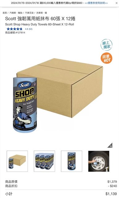 好市多官網Scott萬用強吸力紙抹布在特價 一箱折$240 大概82折左右 原價一張1.91元 特價一張1.58元 大掃除有需要也可以補貨 夠厚也很耐洗 https://i.imgur.com/PSJjLX3.jpg