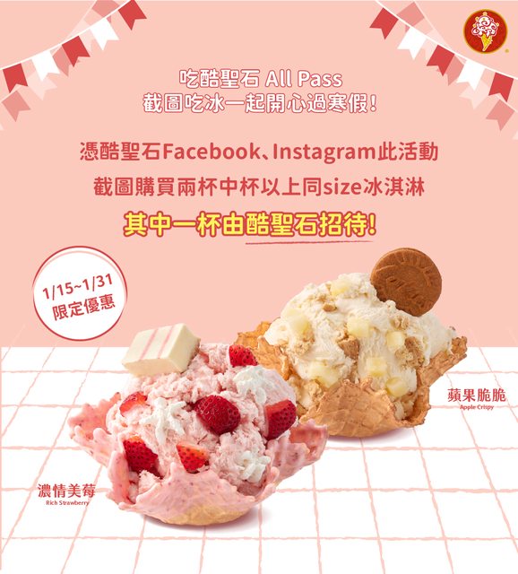 活動日期:1/15~1/31 活動內容:憑截圖購買指定冰品買一送一 https://i.imgur.com/Fi0MD4r.jpg