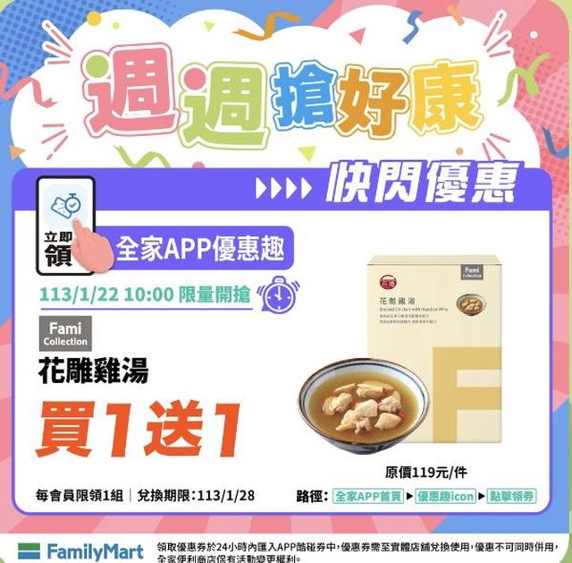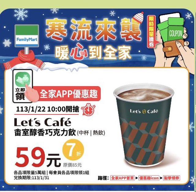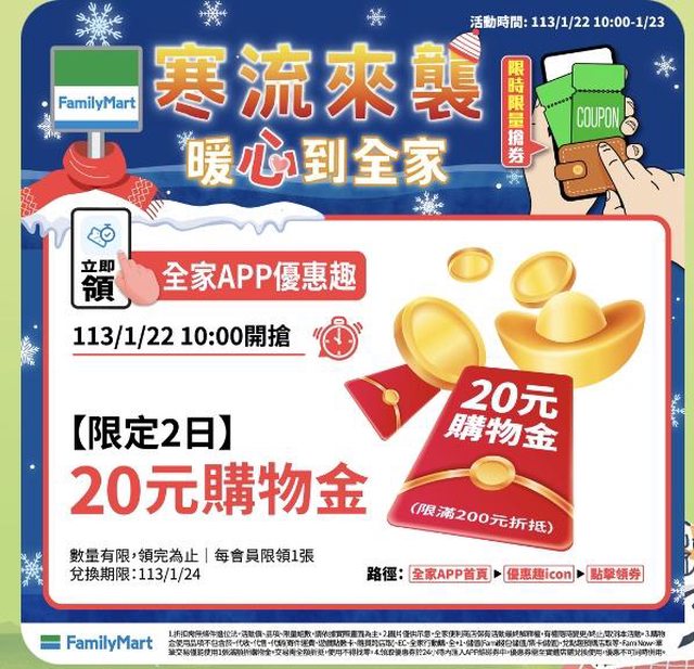 如題,參下圖(截圖出處:全家line)。 優惠券有五張:200元折20元、特定熱飲優惠價、特定商品買一送一。 https://i.imgur.com/CmMVDsR.jpg