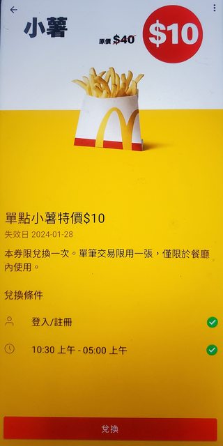 麥當勞App改版後好像就沒有發放過小薯10元優惠券了 今天打開App發現有久違的小薯10元到1/28號 喜歡薯條的朋友可以把握這幾天去吃唷~ 也許日後還有希望變成常見的輪流優惠券?https://i.imgur.com/oNfCaPd.jpg