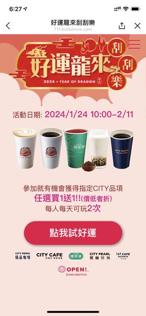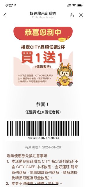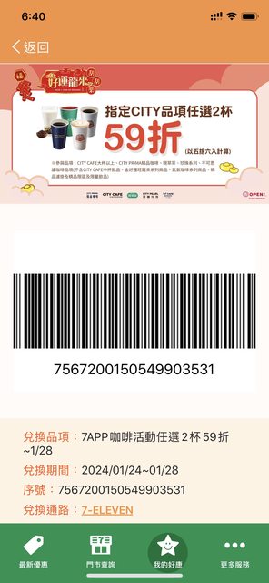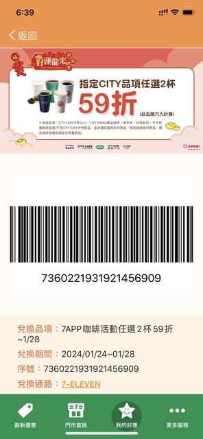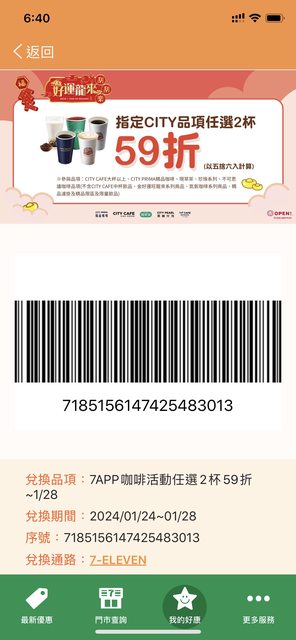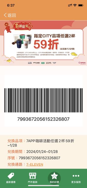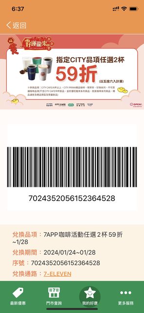 有效期限: 2024-01-28 咖啡優惠券兌換注意事項 本活動參與品項為 CITY 指定系列飲品(不含 CITY CAFE 中杯飲品、金好運旺 龍來系列 商品、氮氣咖啡系列商品、精品濾掛及精品限區及限量飲品)。 本券不得轉賣、轉贈、影印等。 本券僅能刷讀使用一次,請小心保管,若經兌換即無法使用。 本券直接於結帳時,出示條碼給店員刷讀即可。 使用本折價券需一次領取所有消費件數,不得寄杯、不得與其他優惠折價券 併用。 每筆交易限用乙張,優惠券無法重覆使用。若逾期、無法辨識、影印者皆視同 作廢。 本券經兌換完成後,恕無法提供退貨及換貨。 一個帳號每日限抽 2 次,請參加者自行保留優惠條碼,避免優惠被他人兌換 以致無法使 用。 本優惠超過期限後,恕不再重新提供優惠條碼。 優惠商品因各門市於各時段之庫存狀況不一,請顧客兌換前先確認單店是否 有商品可供 兌換。 7-ELEVEN 客服專線:0800-008-711。 贈品不得轉賣、轉贈。 本活動不得與其他優惠併用,商品、贈品數量以各門市實際可販售數量為準, 您應先確 定門市有現貨品項,再進行門市兌換,如遇商品、贈品缺貨或其他不 可抗力之事由,本 公司將保留更換其他商品、贈品之權利。詳細活動辦法依本 公司公告為主。凡參與本活 動,即視同承認及接受本活動注意事項及相關規 定,本公司保有隨時修正、暫停或終止 本活動之權利,若有未盡事宜,悉依本 公司之相關公告辦理;本公司保留最終解釋及決 定權利。 -- ※ 發信站: 批踢踢實業坊(www.ptt-site.org.tw), 來自: 115.165.217.140 (臺灣) ※ 文章網址: https://www.ptt-site.org.tw/Lifeismoney/M.1706355897.A.061