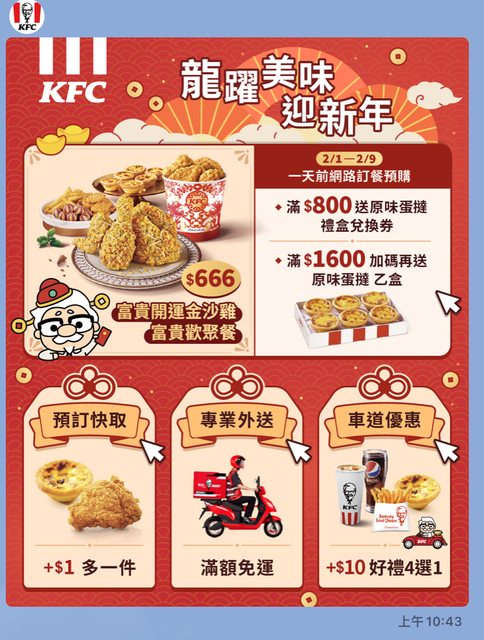 標題[情報] 2/1-9肯德基800送蛋撻禮券1600再送一盒