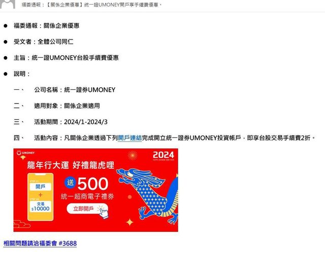 前陣子收到公司信件說開證券戶有不錯的折數 以統一券來說,公司幫忙爭取到2折,算是挺不錯的 畢竟基本上一般證券要這麼低,也要刷不少交易量 不過因為自己是拿到更低的,所以就分享給大家用用 https://i.imgur.com/hNJ8UaB.jpg
