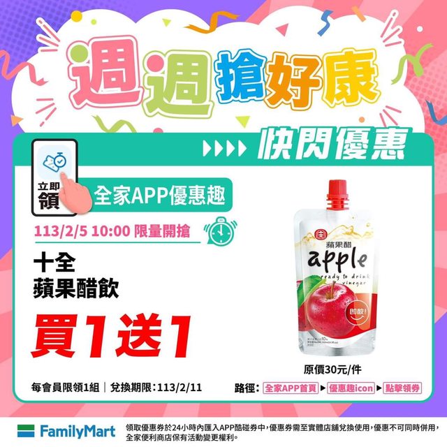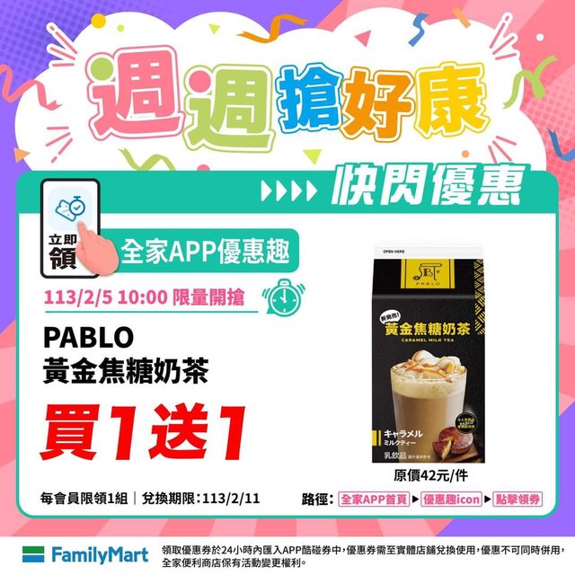 全家app首頁->優惠趣 這次是 PABLO黃金焦糖奶茶 / 十全蘋果醋飲 買1送1 http://i.imgur.com/Z4SVS6E.jpg