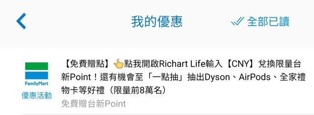 從全家app連到richart life,輸入CNY https://i.imgur.com/GjArAiy.jpg