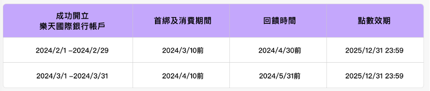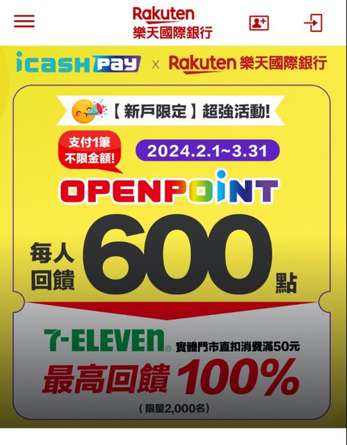 活動名稱:icash Pay連結樂天存款帳戶,最高回饋OPENPOINT 650點! 活動期間:2024年2月1日至2024年3月31日 活動內容: 1.【活動一】首次申辦樂天國際銀行存款帳戶者,於樂天國際銀行申請開戶頁面「推薦序 號」欄位填入專屬優惠代碼「ICASH」,並於開戶完成後,以icash Pay帳戶連結該存款帳 戶直扣付款任一筆消費(不限金額),即可享600點OPENPOINT回饋。 2.【活動二】活動期間以icash Pay帳戶連結樂天存款帳戶於統一超商門市直扣付款單筆 新臺幣50元以上之消費,享50點OPENPOINT回饋(每一帳戶限回饋乙次,本活動回饋限量 2,000名)。 記得專屬優惠代碼「ICASH」全大寫 活動連結:https://www.rakuten-bank.com.tw/portal/campaign/icashpay -- ※ 發信站: 批踢踢實業坊(www.ptt-site.org.tw), 來自: 112.78.76.54 (臺灣) ※ 文章網址: https://www.ptt-site.org.tw/Lifeismoney/M.1707192321.A.882
