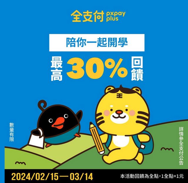 活動:全支付開學季活動 時間:2/15-3/14 活動內容: 單筆不限金額筆筆28.5%全點回饋,單筆最高贈30點,最高可得100點 最高 %全點回饋,綁定帳戶付款享1.5%無上限 指定銀行 元大、國泰、玉山 再加碼2% https://i.imgur.com/bqEUdG9.jpg