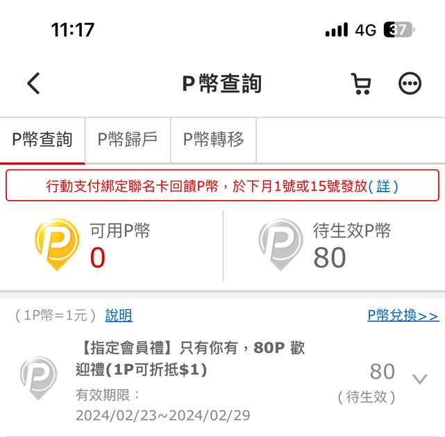 pchome 贈80p幣 使用期間2/23-2/29 不確定其他人會不會拿到100p之類的 總之還是比折價卷好用XD ----- Sent from JPTT on my iPhone -- ※ 發信站: 批踢踢實業坊(www.ptt-site.org.tw), 來自: 42.73.136.112 (臺灣) ※ 文章網址: https://www.ptt-site.org.tw/Lifeismoney/M.1708572026.A.30E