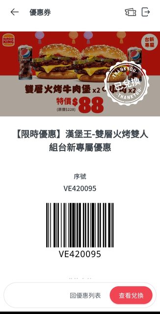 應該刷了就能用 不保證成功 (要用截圖的話建議做好不能用時的備案) 可樂兩杯裝在同一杯環保杯 扣10元=78 其實裝不太下 飲料不能換 可樂喝多有點膩 漢堡有兩片肉 兩片乳酪 酸黃瓜 番茄醬 一個人吃完有點膩 不過這樣88-10=78真的很便宜 ※ 引述《CREA (人間不信)》之銘言 : 台新漢堡王雙層火烤牛肉堡限時優惠券 : 雙層火烤牛肉堡*2+小可*2 : 特價88(用環保杯*2變78) : 2024/02/20~03/13 : 限兌換一次 : https://i.imgur.com/OAYzphD.jpg