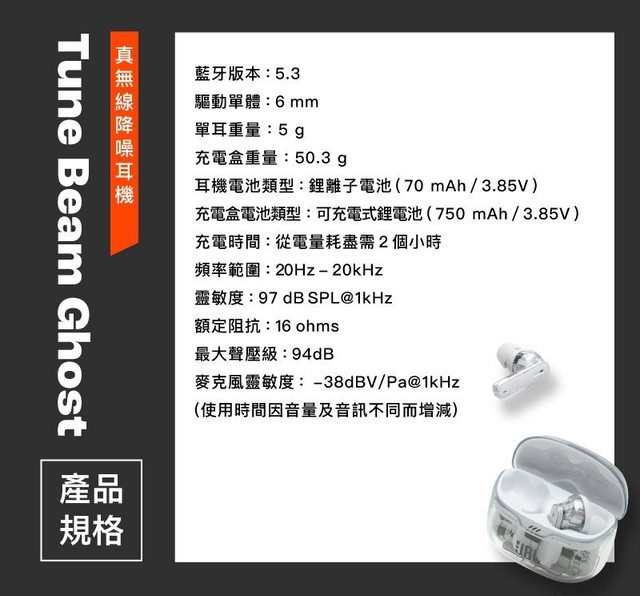這支很少看到公司貨低於3千的 透明的頗帥 有在觀望的可考慮入手了 【JBL】Tune Beam Ghost 真無線降噪耳機(透明系特別版) 時時樂限定優惠2655元 https://reurl.cc/80O9gy 規格如下: https://i.imgur.com/02F8WwV.jpeg
