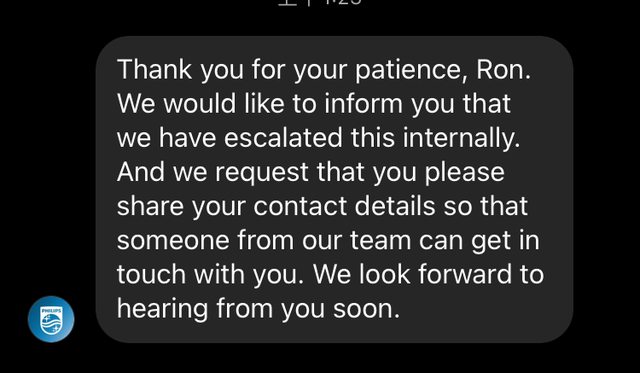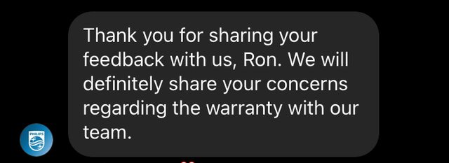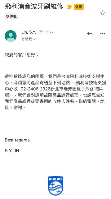 網路找了很久的資訊,最後只找到Philips IG小編,告訴他台灣飛利浦自己的內規違反他 們的全球保固。 隔了一天,小編叫我給他聯絡資料,我就給他email,今天傍晚台灣飛利浦email我,要我 把產品寄回維修中心。 https://i.imgur.com/c0S7XwA.jpg