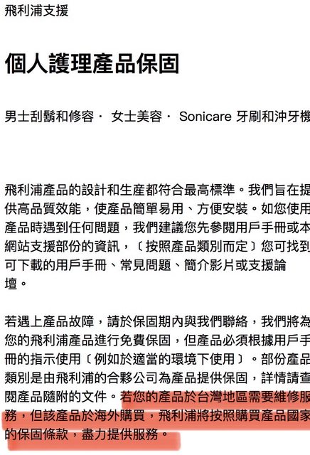 分享台灣保固問題,兩年保固,如果可以維修或更換,應該算省錢 文長,在台灣送修碰壁再看 以前都在台灣買飛利浦電動牙刷,維修只要拿發票或購買證就可以 牙刷是兩年保固 這次想說在美亞(2022)買的會不會不一樣,就致電客服,客服就說要有美亞的保固卡。 事前有先google一下,美國飛利浦的保固只要有效的購買證明。台灣的網站也是一樣,可 是卻要求保固卡。我就問對方白紙黑字、明文規定在哪?!只回答我公司規定。 後來,我又查到一條規定,「若您的產品於台灣地區需要維修服務,但該產品於海外購買 ,飛利浦將按照購買產品國家的保固條款,盡力提供服務。」 https://i.imgur.com/Up51SuI.jpg