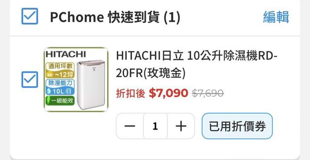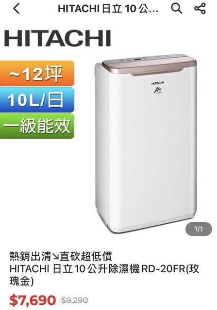 去年7月Panasonic 10L賣6666元轟動一時 再來11月HITACHI 10L賣6999元 今天看到HITACHI的賣場用折價券可以7090元 雖然不是最低,但覺得是可以買的價格了 若搭信用卡網購回饋3~5%,可以再回饋213~355元 除濕機 10L又能退稅900元 今天又有限量4% P幣回饋 代表6000元以下能夠買到 https://24h.pchome.com.tw/prod/DMBQ01-A900GQU1L https://i.imgur.com/YM8nLNY.jpeg