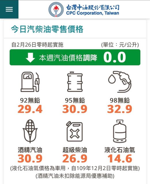 https://www.cpc.com.tw/News_Content.aspx?n=28&s=78910 平穩雙機制及調降貨物稅 汽、柴油各吸收4.1元及4.8元 明(26)日起國內汽、柴油價 格皆不予調整 刊登日期:113-02-25 台灣中油公司自明(26)日凌晨零時起汽、柴油價格皆不予調整,參考零售價格分別 為92無鉛汽油每公升29.4元、95無鉛汽油每公升30.9元、98無鉛汽油每公升32.9元、超級 柴油每公升26.9元。本週因雙重平穩機制啟動,汽、柴油各吸收1.9元及3.2元。 台灣中油表示,因中東地緣政治情勢仍趨緊繃,國際油價微幅上漲。浮動油價調整原 則之調價指標7D3B週均價上漲0.26美元,新臺幣兌美元匯率貶值0.102元,國內油價依公 式計算漲幅為0.51%。按浮動油價機制調整原則,汽、柴油應調價格與本週參考零售價格 相比,汽、柴油應各調漲1.9元及3.2元,惟為維持價格低於亞洲鄰近國家(日、韓、港、 星),汽、柴油各吸收1.6元及2.9元,吸收後95無鉛汽油超出30元,啟動油價平穩措施, 第一階段吸收25%調幅四捨五入,汽、柴油每公升各吸收0.3元。雙重平穩機制啟動,汽、 柴油共各吸收1.9元及3.2元,國內汽、柴油實際每公升價格不予調整。吸收金額如下表: https://i.imgur.com/fQOjnD3.jpeg