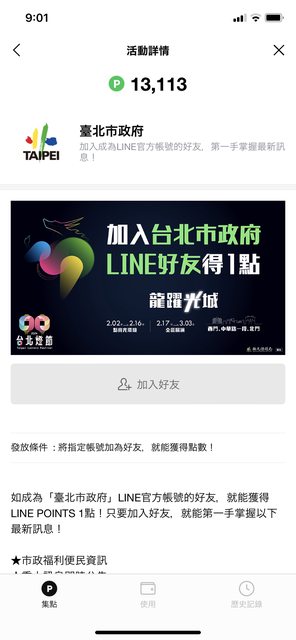 line point加入好友任務 加入後可立即獲得1點 https://i.imgur.com/n4D44OH.jpg