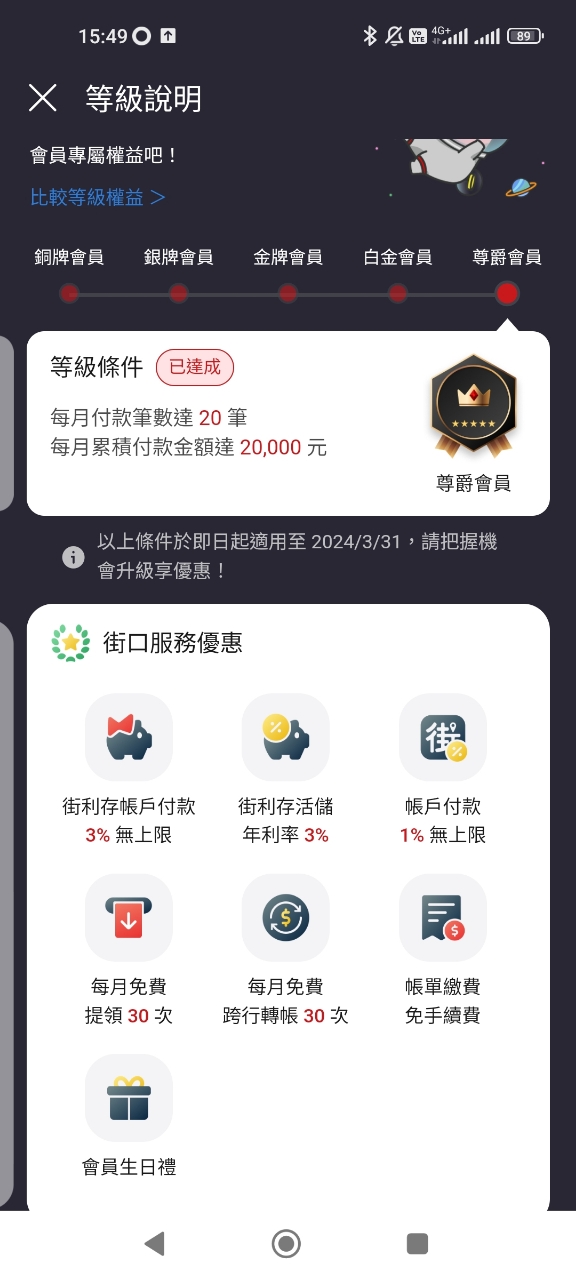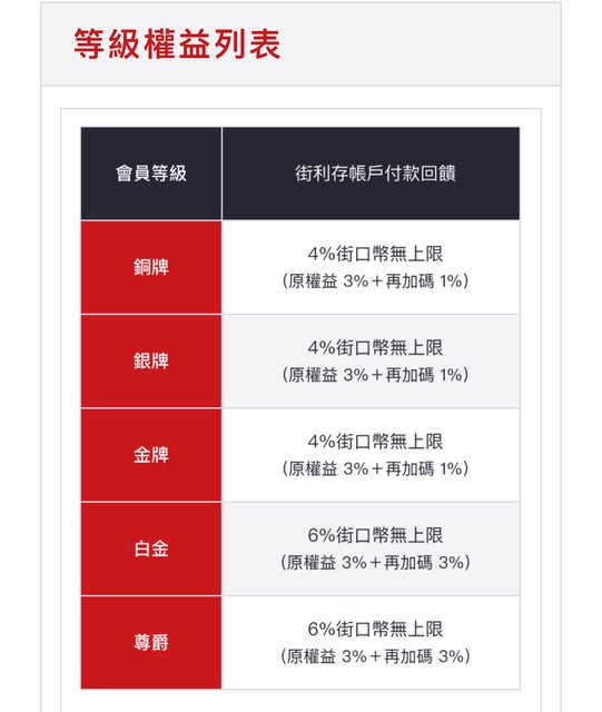 活動時間:2024/3/5 (二) 00:00 - 23:59 活動當日選擇綁定「街利存帳戶」付款: -「尊爵、白金會員」筆筆付款可享 6% 街口幣即時回饋無上限! -「金牌、銀牌、銅牌會員」筆筆付款可享 4% 街口幣即時回饋無上限! 不限名額、免登錄即享優惠 https://i.imgur.com/W57cMiN.png
