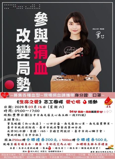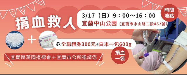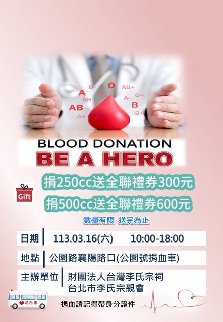3/16(六):北市公園號捐血車 10:00~18:00 送全聯禮券$300/$600 https://i.imgur.com/2a6cEZD.jpg