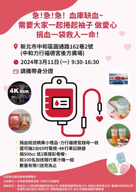 3/11(一):新北中和安邦街力行福德宮後方廣場 09:30~16:30 送隨行果汁機、錢母、摸彩65吋電視、4K行車紀錄器等好禮 https://i.imgur.com/DKOhepe.jpg