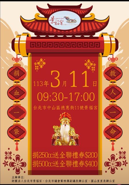 3/11(一):北市德惠街(景福宮) 09:30~17:00 送全聯禮券$200/$400 https://i.imgur.com/GlsJWZV.jpg