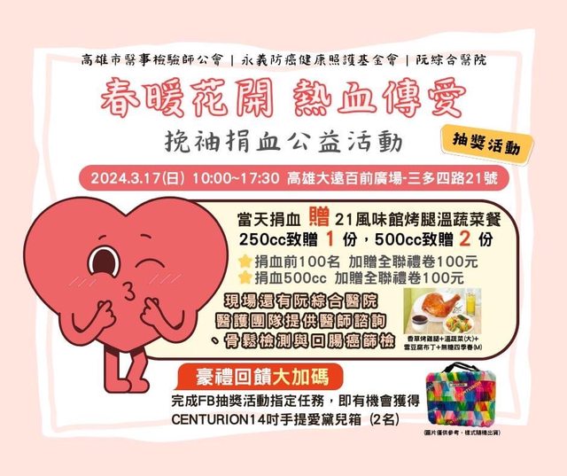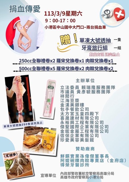 3/23(六):高雄小港中山國中 09:00~17:00 送禮券$200等諸多好禮(詳見圖)/加倍送 #檢驗不能捐者送抑菌液 #有免費義剪 https://i.imgur.com/AbRwLaY.jpg