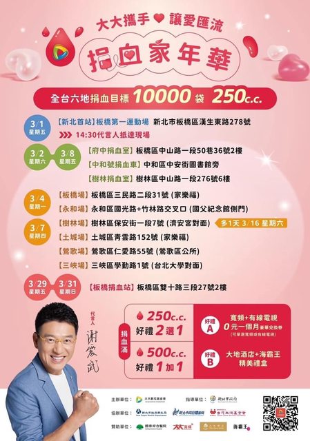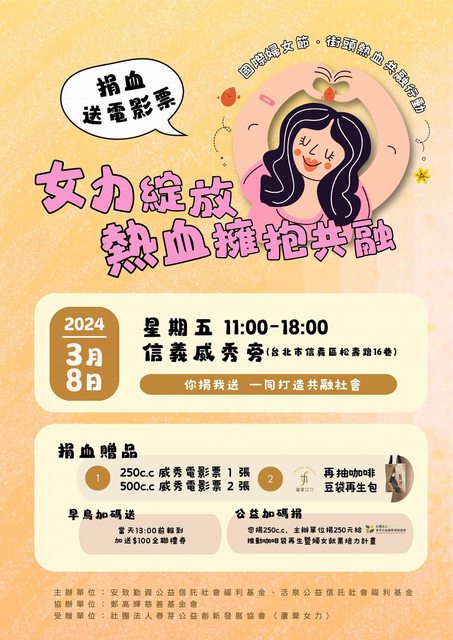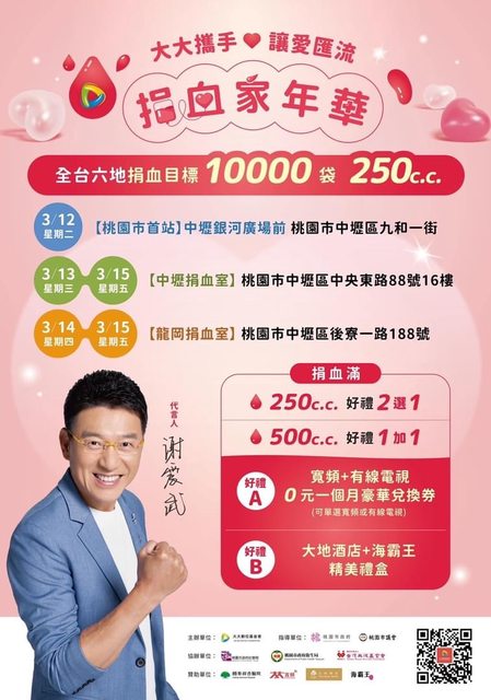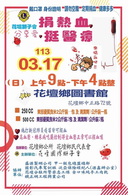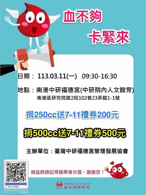 到各地捐血室可善用網路預約捐血,減少等候時間,預約捐血網址: https://dh.blood.org.tw/donor/appointment_login-1.htm 以後要捐血的前一天(或當天)先登入並完成健康問卷,到現場填問卷只需要完成 最後三題即可,並且要查詢檢驗報告也可以到此網站進行下載查看,也可以預約 一個月內的血小板或全血「僅限固定捐血點」;捐血車可在活動開始前兩天預填 (例如:5/1舉辦捐血活動,4/29凌晨起可以填表),到現場後只需填最後三題。 https://dh.blood.org.tw/donor/index.htm 補充:在捐血間隔到達的前一日才會開放健康問卷填寫噢<3 登入[捐血人網站]可查詢自己目前所得捐血點數,還可設定寄送電子報告,這樣 檢驗報告完成的第一時間就可得知(當然也可去愛捐血line@設定檢驗報告完成時 可發訊息通知的功能哦)。 ▏▎▍▋▊▉ [北市/新北/基隆地區] ▏▎▍▌▋▊▉ ﹊﹊﹊﹊﹊﹊﹊﹊﹊﹊﹊﹊﹊﹊﹊﹊﹊﹊﹊﹊﹊﹊﹊﹊﹊﹊﹊﹊ 《台北捐血中心官網:https://www.tp.blood.org.tw/Internet/taipei/index.aspx 〝〝〝台北捐血中心臉書粉絲團:https://www.facebook.com/taipeiblood〞〞〞 3/8(五):北市信義威秀旁 11:00~18:00 送電影票一張/二張 #13:00前報到加贈全聯禮券$100 https://i.imgur.com/cfi5ggM.jpg