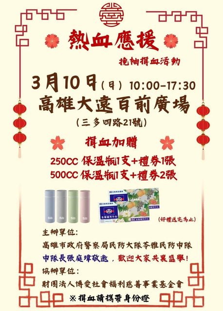 3/10(日):高雄大遠百前廣場 10:00~17:30 送禮券一張/二張,皆有送保溫瓶 https://i.imgur.com/acM8B8Q.jpg