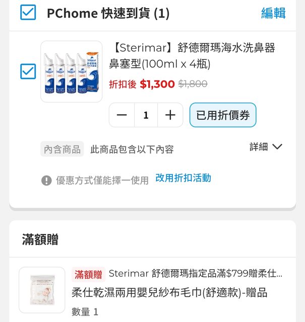 PChome舒德爾瑪海水洗鼻器 鼻塞型(100ml x 4瓶),目前有折價券500,折扣後$1,300。 http://i.imgur.com/TKatE0D.jpg