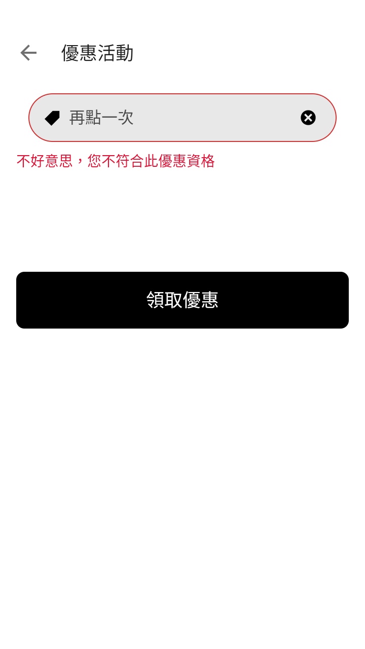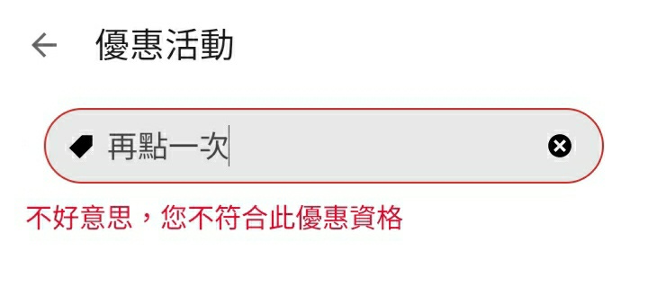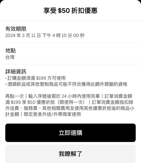 親測可用(不確定是否分眾) 輸入序號:再點一次 2024/3/15 23:59 前,美食外送/外帶單筆訂單消費金額滿 $199(指扣除外送費、服務費、其他相關費用及使用其他優惠折抵後的商品小計金額),可享 $50 優惠折抵 輸入序號後需於 24 小時內使用完畢。每個帳號限使用一次,限收到此信件者使用,轉發/轉售無效。 https://i.imgur.com/FXCWitm.jpeg