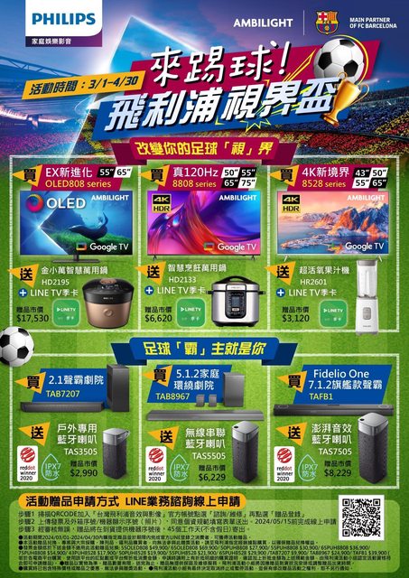 電視之前好像送聲霸 這次送的是一般家電,不過內容價值也不低 不同型號送的東西不同 電視的部份 55 / 65吋 OLED808系列 送HD2195 金小萬智慧萬用鍋+LINE TV季卡 50 / 55 / 65 / 75吋 PUH8808 120HZ系列 送HD2133 萬用鍋+LINE TV季卡 43 / 50 / 55 / 65吋 PUH8528系列 送HR2601果汁機+LINE TV季卡 聲霸的部份 Fedelio TAFB1 送TAS7505藍牙喇叭 TAB8967 送TAS5505藍牙喇叭 TAB7207 送TAS3505藍牙喇叭 個人是覺得OLED808頗划算 digitalhome版的55OLED808大約44900 送的贈品也大約要一萬多 等於55OLED808實際花費大約3萬初就有 -- ※ 發信站: 批踢踢實業坊(www.ptt-site.org.tw), 來自: 223.137.167.187 (臺灣) ※ 文章網址: https://www.ptt-site.org.tw/Lifeismoney/M.1710750615.A.96B