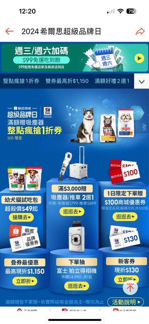 養毛孩的爸媽可以參考,滿多獸醫會推薦吃希爾思這個品牌,今天超品日活動很多種 滿3000送吸塵器或手推車 https://i.imgur.com/aiLWPbU.jpg