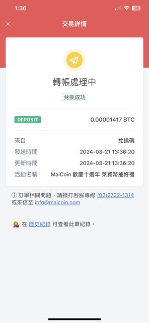 活動平台 : MaiCoin 活動時間 : 2024 / 3 / 11 ~ 2024 / 4 / 7 活動方式 : 萊爾富買指定商品就送比特幣! 活動期間在萊爾富購買「樂法日式綠茶 / 錫蘭紅茶 650 ml」任 2 件,就送等值台幣 30 元比特幣兌換碼。 兌換碼將附於結帳後熱感紙上,輸入即可兌換 (熱感紙若遺失或毀損,恕不補發)。 本兌換碼僅限 MaiCoin 數位資產買賣平台 Lv.1 以上帳戶使用,並需於 2024/4/30 前註冊兌換,逾期失效。 一人限使用本活動兌換碼一次。 附上人權圖 https://i.imgur.com/JR4qiTa.jpg