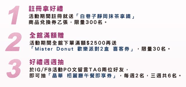 另外也有新會員的註冊禮 ((可惜我之前註冊時啥都沒有 還好這次活動新舊會員都有優惠 https://i.imgur.com/Dd2w40q.png