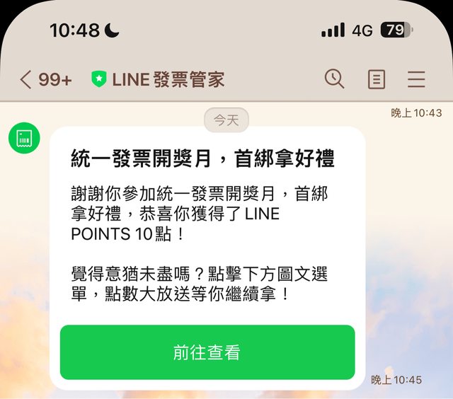 ※ 引述《QQOQQO (QooQoo)》之銘言: : 首次綁定LINE發票管家可以拿到10點 https://i.imgur.com/Pg5ixTb.jpg