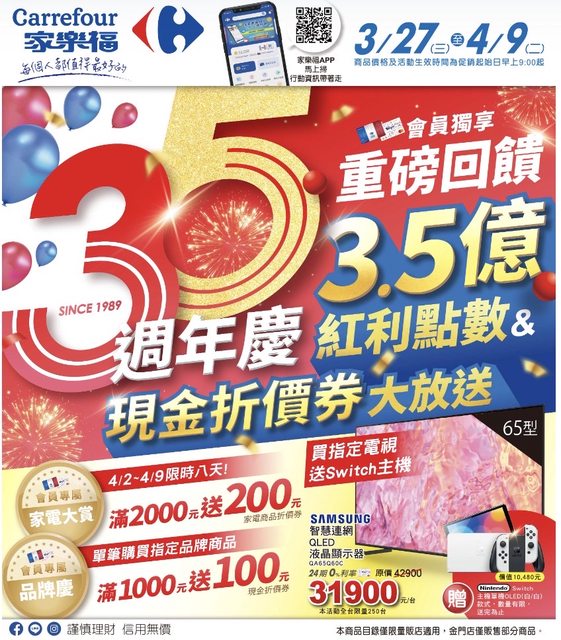 下班到家樂福買晚上要煮的菜看到 這次家樂福35週年的優惠也太澎湃了一點 來分享幾個看到覺得很划算的~ 1.超多品牌商品滿1000元就送100元現金券 另外還有指定商品紅利點數35倍送跟之後家電滿額折價 加上政府節能補助,買家電可以趁這波省不少 2.會員不限通路單筆消費滿2000元有機會抽中1000萬紅利點數 (這個真的超級有感) 3. 滿額隨機送35元或350元折價券 (量販店需滿1000元、超市店需滿500元) 總之優惠很多大家可以直接上官網或到現場看, 我也要來研究看看有沒有什麼東西需要補貨了XD https://i.imgur.com/PWHSiSA.jpg