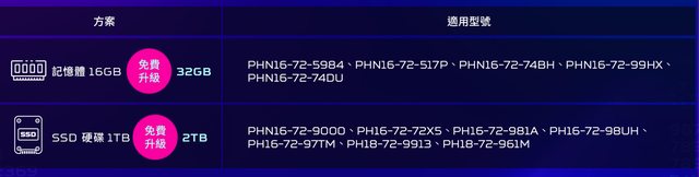 時間到四月底前 型號有點多要自己對一下 不同的型號會送的東西會不同 大致上來說就是 出廠是16G的話會再多送一條16G 出廠是32G的話就是SSD變2T給你 然後全系列主機跟螢幕多送一年保固(要上官網登錄) -- ※ 發信站: 批踢踢實業坊(www.ptt-site.org.tw), 來自: 223.137.68.28 (臺灣) ※ 文章網址: https://www.ptt-site.org.tw/Lifeismoney/M.1712039876.A.212