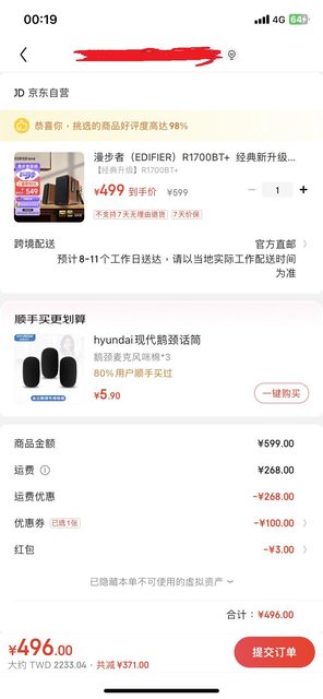 包郵10KG等於可折最多298的運費 另可再領50元運費券疊加上去 訂單部分 滿999-150 滿599-100 滿399-40 另外有個188新人專享的活動 消費滿388-88 直郵運費券100 這我下完才看到…已經不是新人了… 就沒辦法領去試能否與上面疊加了 約10天前想買喇叭(平時都用耳機) 查了一下似乎很推漫步者 開始學大家想在京東撿便宜 (帳號辦好久了但沒買過東西) 蹲到今天,剛不抱期望的看了一下 還真的蹲到運費優惠 馬上下了一台R1700BT+來當初體驗 看沒人發消息,這樣應該有省到吧XD -- ※ 發信站: 批踢踢實業坊(www.ptt-site.org.tw), 來自: 49.216.225.139 (臺灣) ※ 文章網址: https://www.ptt-site.org.tw/Lifeismoney/M.1713806315.A.94B