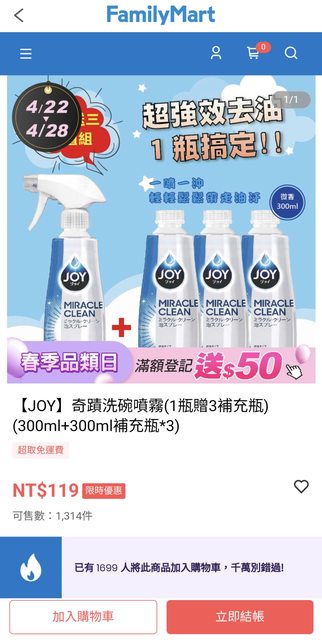 如題,全家行動購 JOY洗碗噴霧1瓶+3補共四瓶 $119,現在買有免運,搜了一下應該是低價,雖然寫不能跟折價券並用但我是有成功用上10%券,供需要的版友參考。 https://pse.is/5vdyn3 是說最近全+1和全家行動購合併了,但續存的居然是全家行動購...明明就是全+1的介面比較好用啊... ----- Sent from JPTT on my Sony XQ-BC72. -- ※ 發信站: 批踢踢實業坊(www.ptt-site.org.tw), 來自: 1.162.89.183 (臺灣) ※ 文章網址: https://www.ptt-site.org.tw/Lifeismoney/M.1714186983.A.BEC