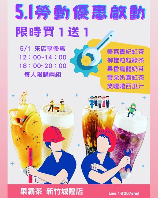 時間 : 5/1(三),12:00~14:00、18:00~20:00 地點 : 新竹市北區西大路415號,城隍廟附近 優惠 : 美荔貴妃紅茶(40),柳橙粒粒綠茶(80),果香烏龍奶茶(50), 雲朵奶霜紅茶(60),笑嘻嘻西瓜汁(50),以上五種飲品買一送一 理由 : 勞動節(ˊ_>ˋ) https://i.imgur.com/lDDBr93.png